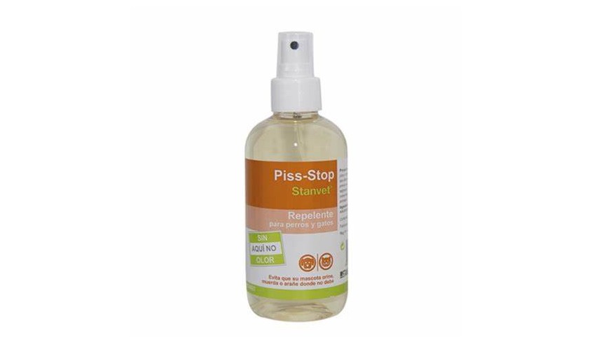 Piss Stop 200 ml es un spray repelente de Stangest que ayuda a prevenir que perros y gatos hagan sus necesidades en zonas no deseadas del hogar, como muebles, alfombras o paredes. Su fórmula natural es segura para mascotas y personas, y no deja olores desagradables.