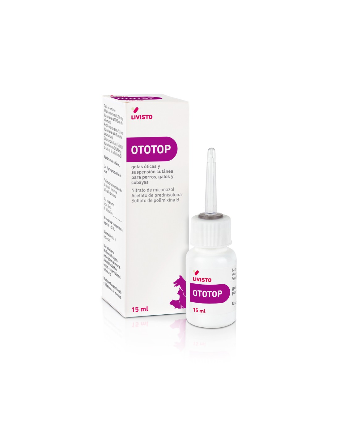 Advertencias: La otitis bacteriana y fúngica suele ser secundaria; se debe identificar y tratar la causa subyacente. Evitar la ingestión oral del medicamento por parte de los animales tratados o aquellos en contacto con ellos. No usar en animales con resistencia conocida a la polimixina B y/o al miconazol.