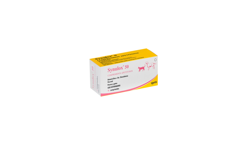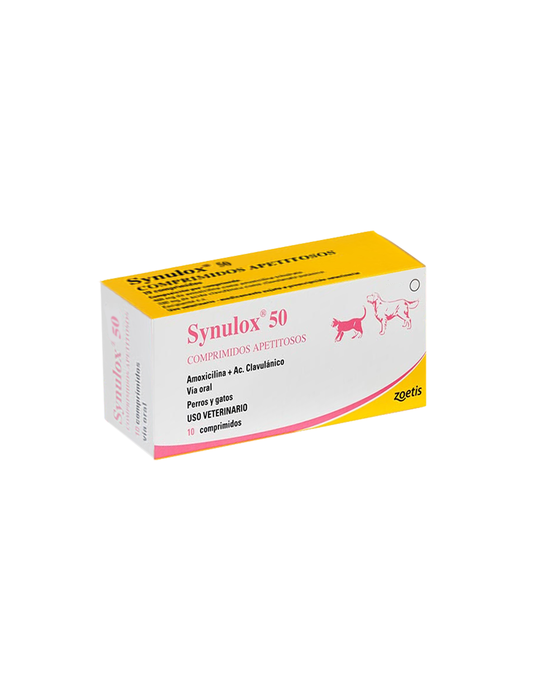 Synolux 50 mg es una efectiva combinación de amoxicilina y ácido clavulánico en comprimidos especialmente diseñados para el tratamiento de infecciones en perros y gatos. Ideal para combatir infecciones del tracto digestivo, respiratorio, urogenital, así como de la piel y tejidos blandos, asegurando la recuperación y el bienestar de tu mascota.