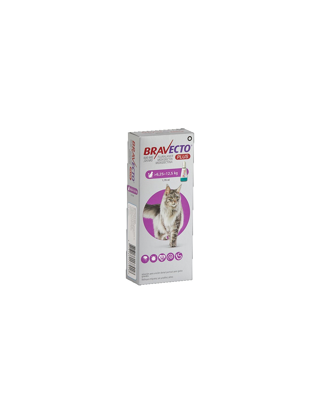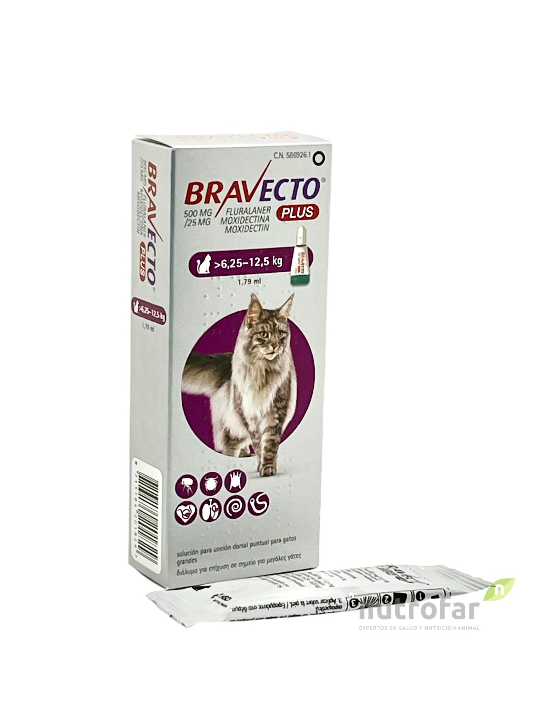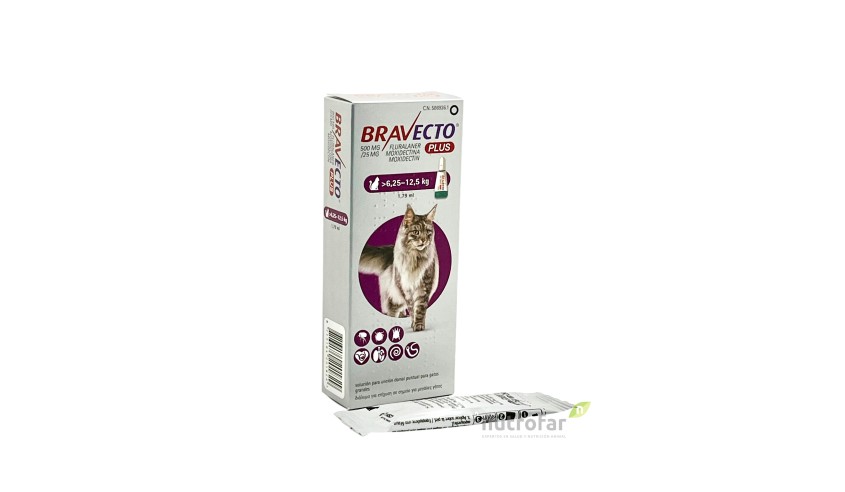 Bravecto Plus está indicado para gatos con o en riesgo de infestaciones parasitarias mixtas por garrapatas, pulgas, ácaros del oído, nematodos gastrointestinales, gusano del corazón o gusano pulmonar. Proporciona actividad insecticida inmediata y persistente frente a pulgas (Ctenocephalides felis) y garrapatas (Ixodes ricinus) durante 12 semanas.