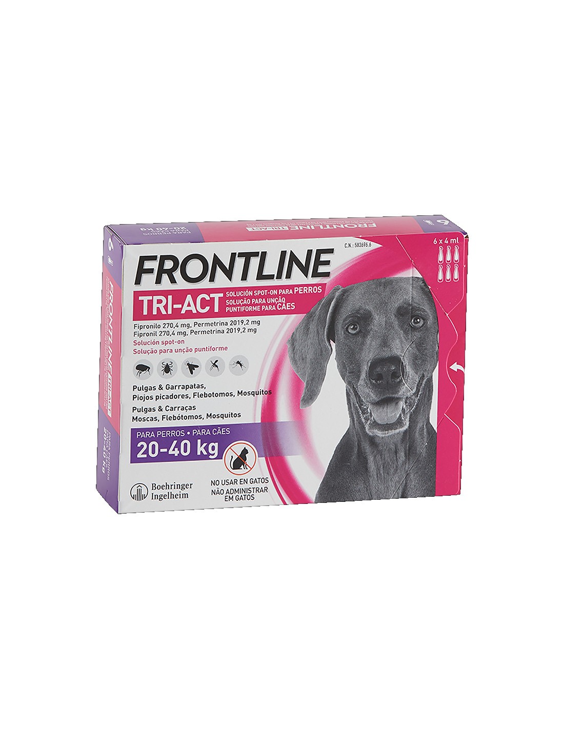 Frontline Tri-Act está indicado para el tratamiento y prevención de infestaciones por pulgas y garrapatas en perros. También proporciona una actividad repelente contra flebótomos, moscas picadoras y mosquitos. Es eficaz en el tratamiento de la dermatitis alérgica por picadura de pulgas.