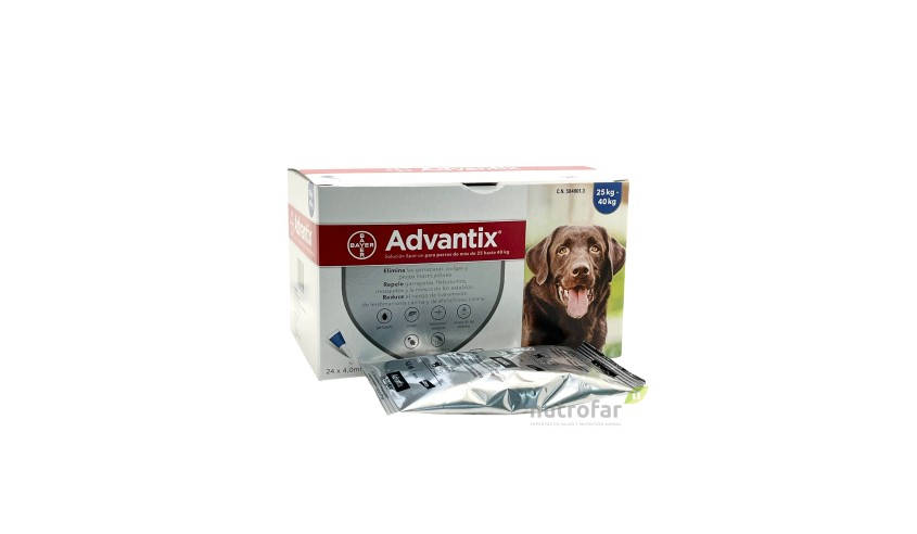 - Advantix Spot-on para Perros de más de 25 kg hasta 40 kg: Imidacloprid 400 mg; permetrina 2000 mg; butilhidroxitolueno.