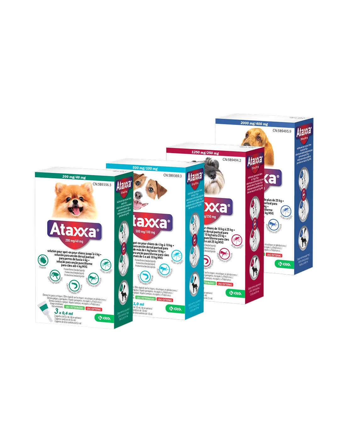La administración de Ataxxa es sencilla, aplicándose mediante unción dorsal puntual. Es importante aplicar el producto en la piel no dañada del perro para asegurar su eficacia. Cada caja de Ataxxa contiene 3 pipetas.