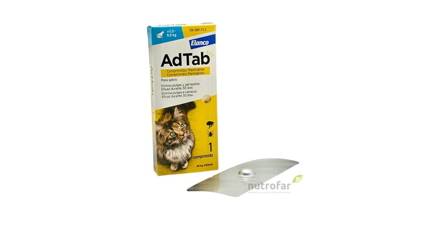 Adtab 48 Mg Comp Masticable Gato (>2-8 Kg) es un medicamento veterinario diseñado para combatir las infestaciones de pulgas y garrapatas en gatos. Contiene el principio activo Lotilaner, el cual proporciona una acción inmediata y persistente durante un mes.