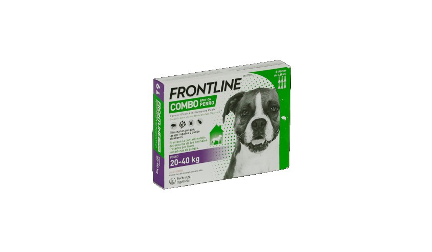 Frontline Combo Spot-On Perro 20-40 kg es un antiparasitario externo en solución spot-on para perros de 20 a 40 kg, que elimina pulgas, garrapatas y piojos, y previene la contaminación del entorno por huevos y larvas.
