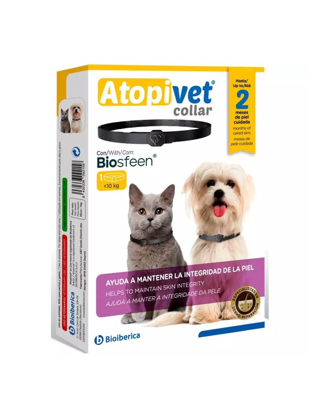 Atopivet Collar 35 cm es un dispositivo dermatológico destinado a mejorar la salud de la piel en gatos y perros pequeños (<10 kg). Su fórmula libera de forma sostenida ácidos grasos esenciales, bioactivos cutáneos y moléculas hidratantes que refuerzan la barrera epidérmica, reducen el prurito y favorecen una piel más resistente y equilibrada. Está indicado como apoyo en la dermatitis atópica y en pieles sensibles, secas o con tendencia a irritación.