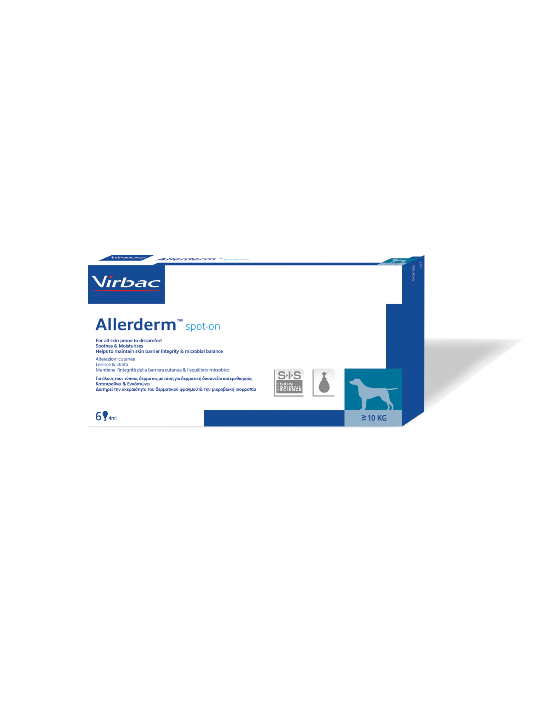 Allerderm Spot On 4 Ml Perro +10 Kg 6 pipetas ayuda a mantener la protección de la barrera cutánea con agentes hidratantes y a mantener la vitalidad de la piel. También ayuda a controlar la flora y la defensa natural de la piel.