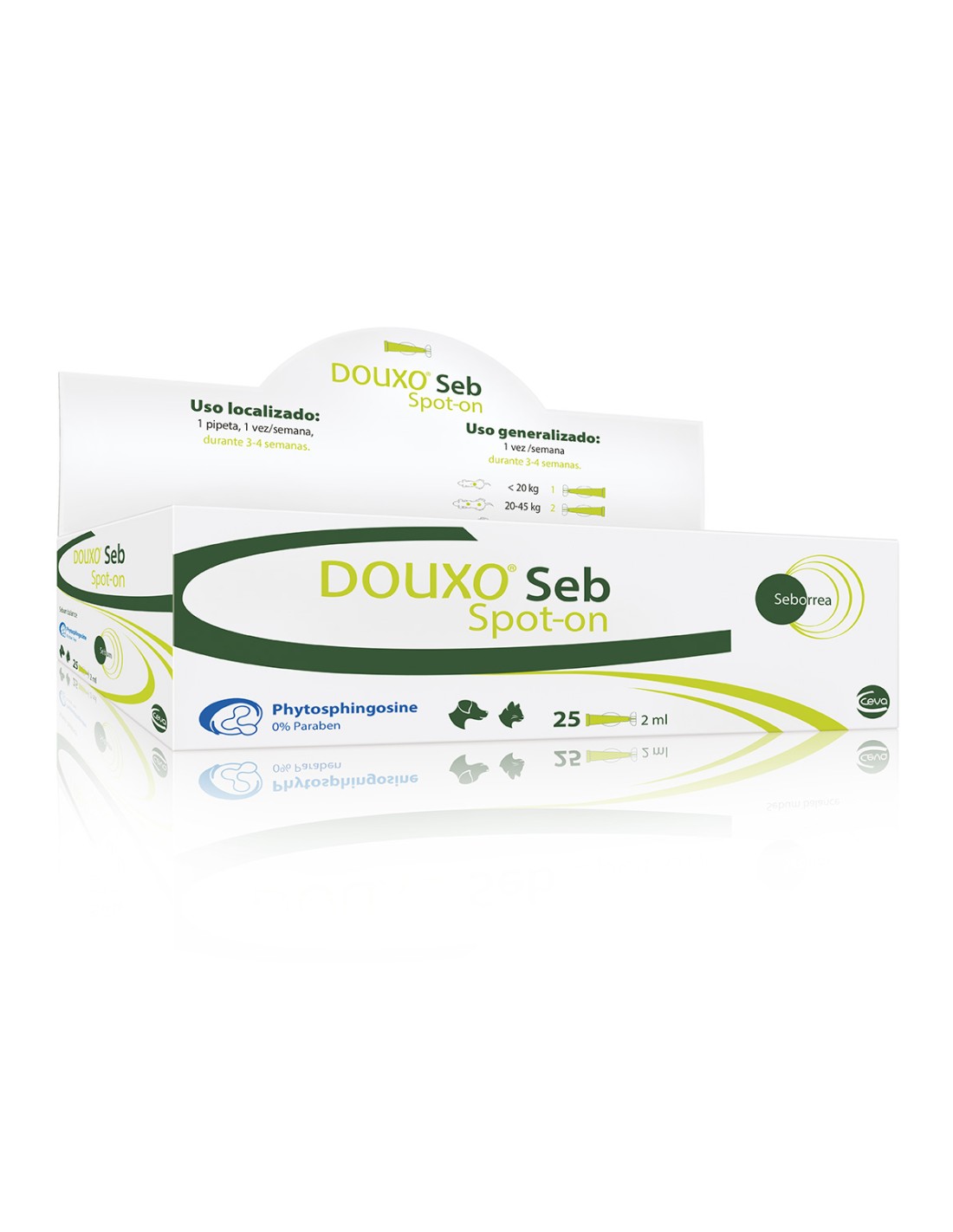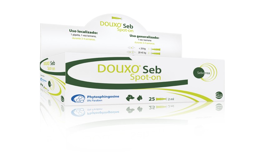 La administración local de Douxo Seb Spot-On ayuda a restaurar el estrato córneo de la piel, regular la seborrea y la inflamación asociada, y controlar la proliferación de bacterias en la superficie cutánea. Esta solución contiene una elevada concentración de fitoesfingosina junto con un excipiente para lograr una óptima difusión y penetración de la sustancia activa.