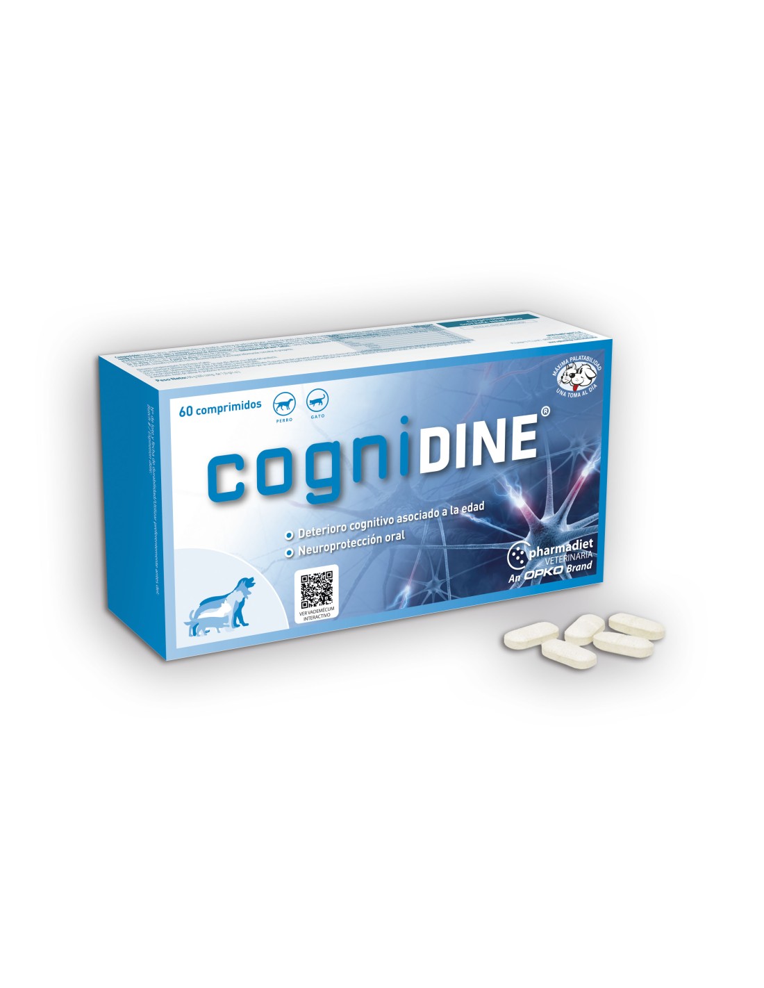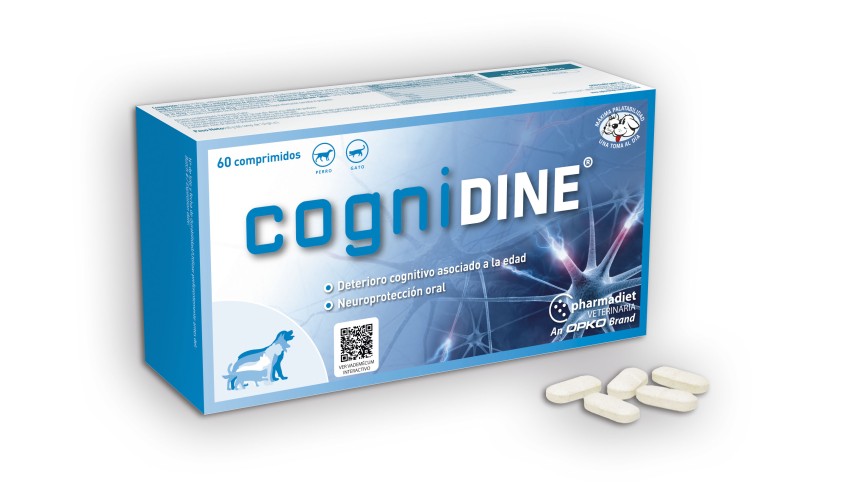 Los comprimidos de Cognidine son un alimento complementario diseñado especialmente para agregar a la dieta de mascotas en edad avanzada con el fin de mantener y mejorar su sistema cognitivo. Estos comprimidos contienen una potente combinación de nutrientes esenciales, tales como la biotina, la pulpa de manzana seca, la uridina y el triptófano, que han demostrado de manera concluyente ser beneficiosos para la salud mental y cognitiva de las mascotas.