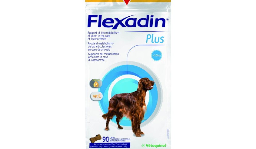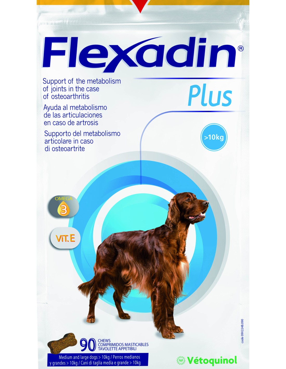 Flexadin Plus Max +10 kg, presentado en un envase de 90 comprimidos masticables, es un complemento dietético diseñado para apoyar el metabolismo articular en perros medianos y grandes, especialmente en casos de artrosis.