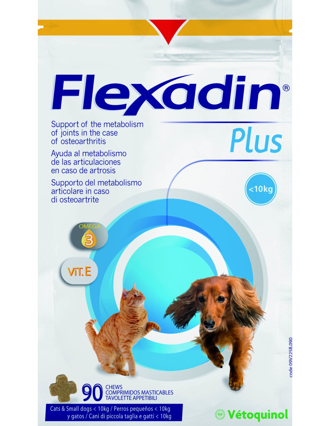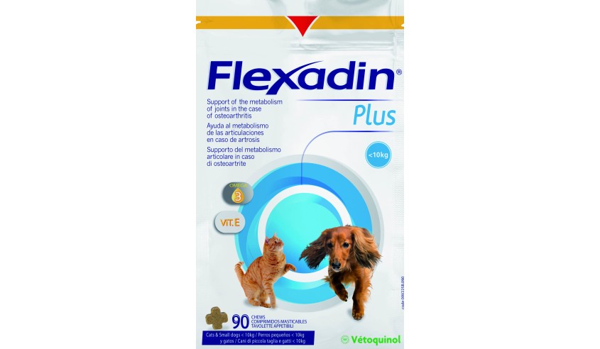 Flexadin Plus Mini <10 Kg es un alimento complementario dietético para perros y gatos, que ayuda al metabolismo de las articulaciones en casos de artrosis. Los comprimidos masticables son altamente palatables para una fácil administración una vez al día.