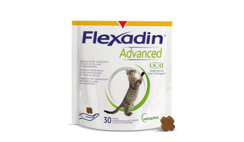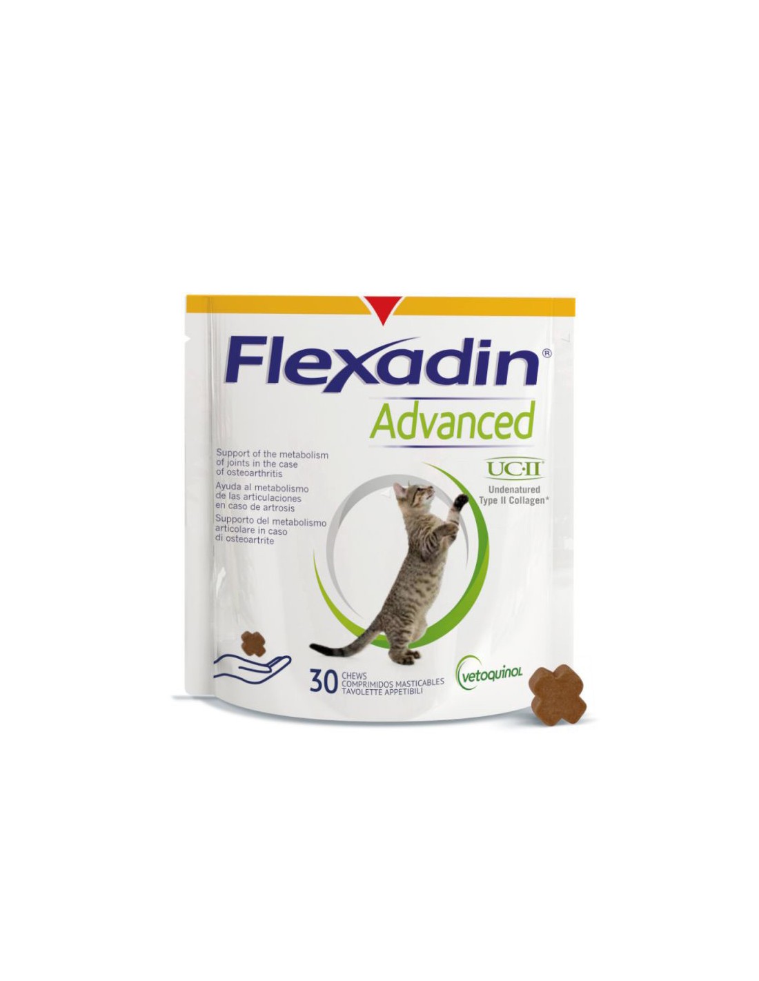 Flexadin Advance UCII 30 Chews Gatos es un complemento dietético para articulaciones con osteoartritis (UC II, Omega 3, Vitamina E, Manganeso, Metionina).