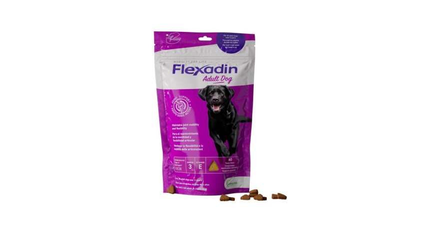 Flexadin Soft Chew Adult 60 tabs, un suplemento nutricional en forma de comprimidos masticables, está diseñado para apoyar la salud articular en perros adultos, gracias a su fórmula enriquecida con UC-II, Omega 3 y Vitamina E.