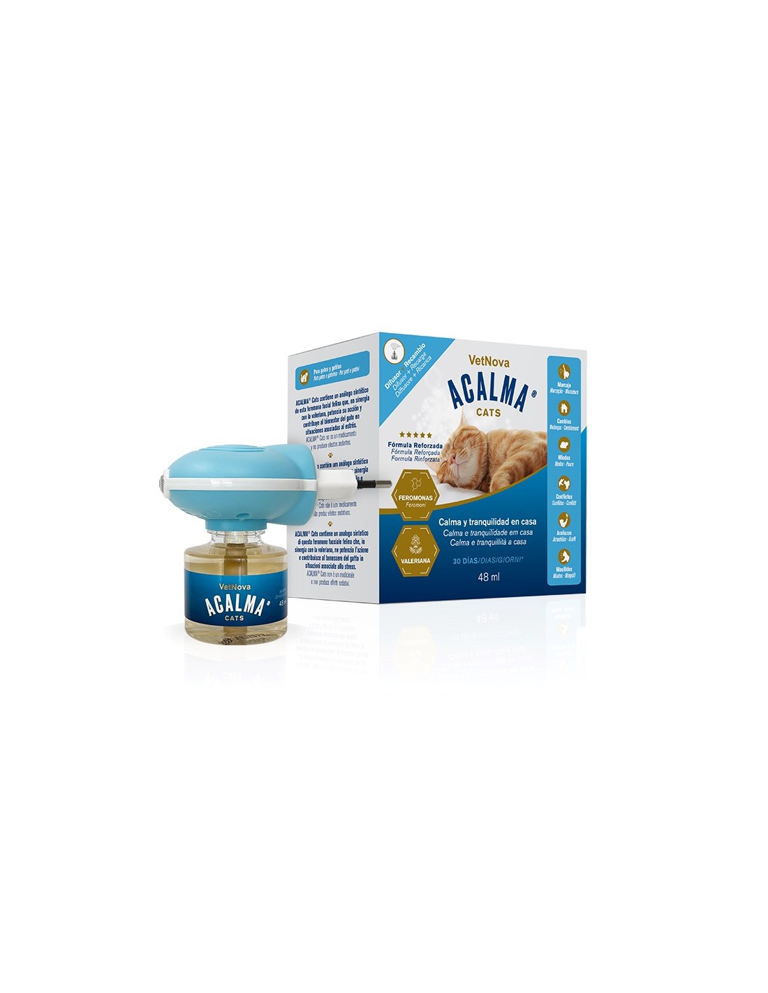 ACALMA CATS DIFUSOR + RECAMBIO 48 ML es una solución diseñada especialmente para reducir el estrés y la ansiedad en gatos mediante un difusor de fácil uso. Este dispositivo, acompañado de un recambio de 48 ml, libera una mezcla de ingredientes naturales que crean un ambiente de calma y confort para el bienestar del felino, ideal para situaciones de tensión como visitas al veterinario, mudanzas o cambios en el hogar.