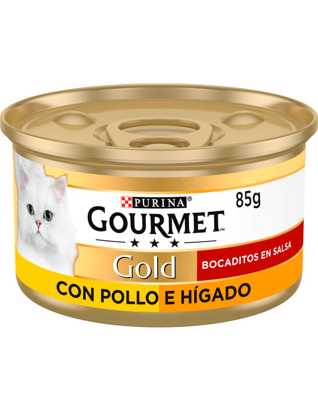 PURINA® GOURMET® Gold Bocaditos en Salsa lata de 85g. Comida húmeda para gato con Pollo e Hígado. Tiernos trocitos de carne en deliciosa salsa.