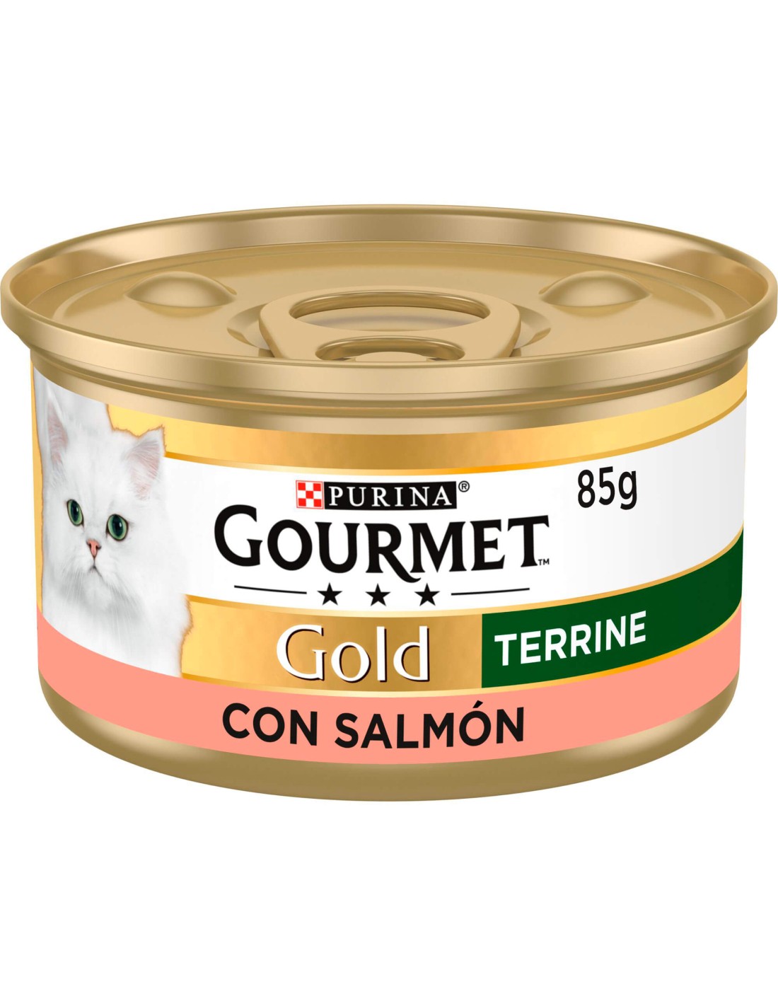 PURINA® GOURMET® Gold Terrine lata 85g. Comida húmeda para gato. Trocitos finamente cortados de Salmón con una ligera y apetitosa textura.
