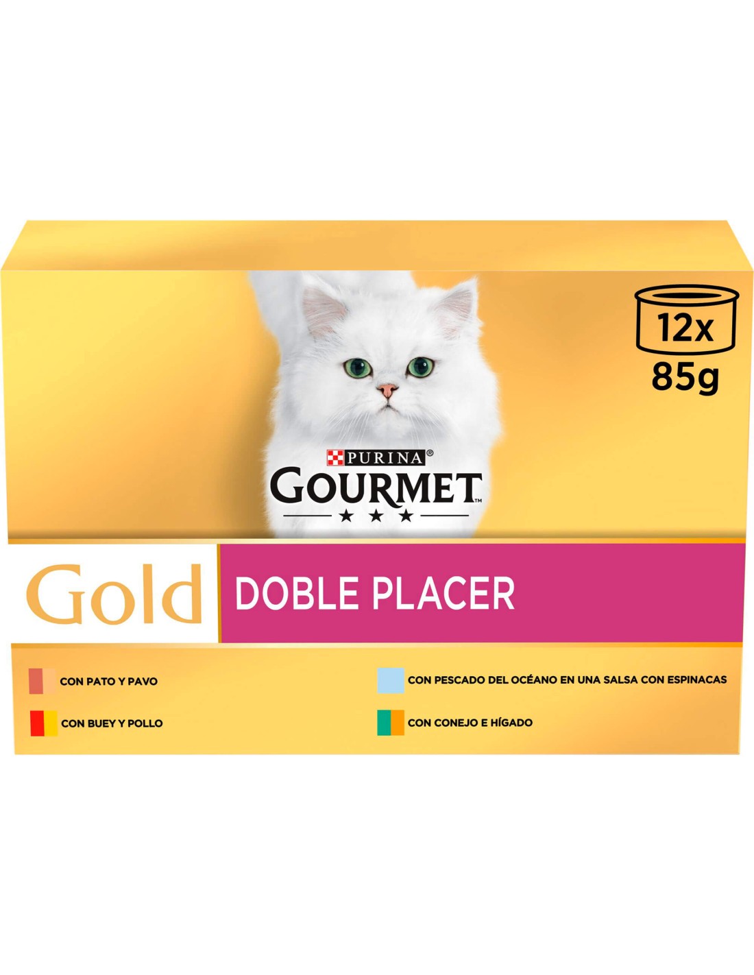 GOURMET Gold Doble Placer combina tiernos trocitos con láminas suavemente cocinadas para ofrecer a tu gato una experiencia única de sabores y texturas. Diseñado para satisfacer su sofisticado paladar, brinda una mezcla deliciosa en cada comida, ideal para gatos que disfrutan de variedad y calidad.