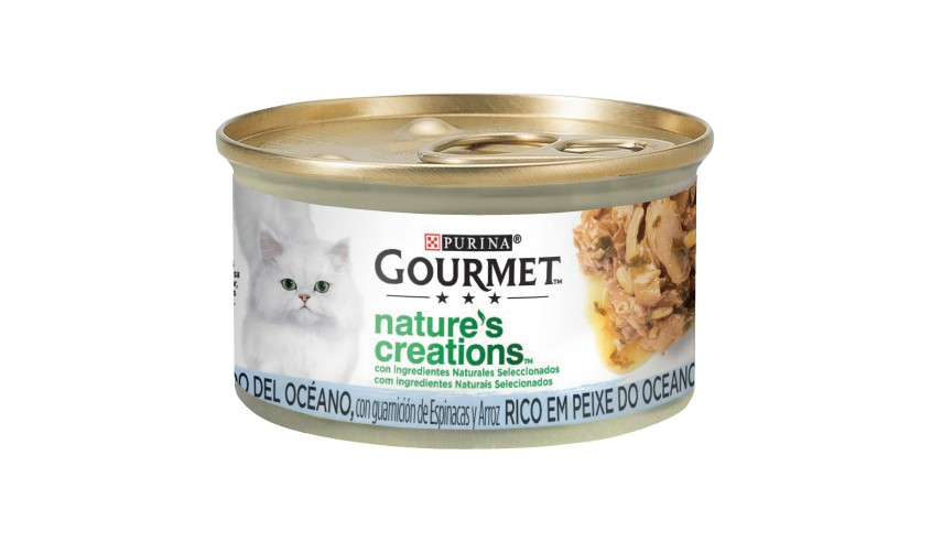PURINA® GOURMET® Nature's Creations 4 latas de 85g. Comida húmeda para gato. Recetas deliciosas ricas en pescado, con ingredientes naturales.