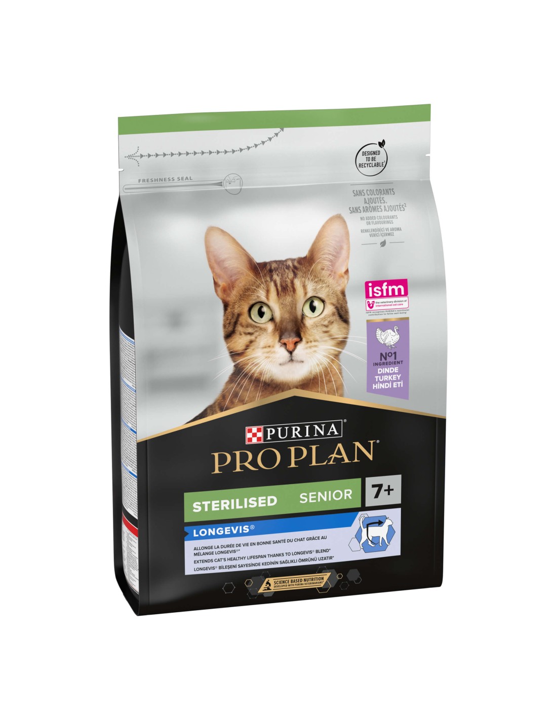 PURINA® PRO PLAN® STERILISED Senior 7+ LONGEVIS® es un alimento completo para gatos de más de 7 años esterilizados, rico en salmón, que prolonga una vida saludable en gatos sénior gracias a la formulación especial de la combinación LONGEVIS®. 3kg