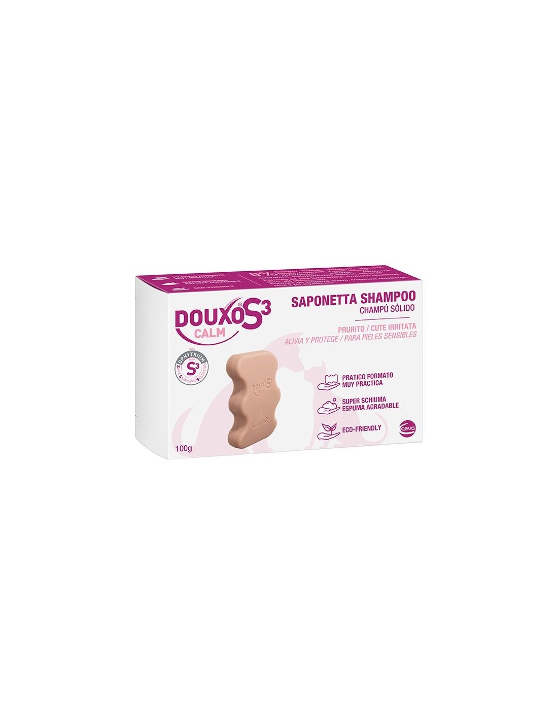 DOUXO S3 CALM Shampoo Bar es una barra sólida diseñada para aliviar la piel irritada, con picor o alérgica en perros y gatos. Formulada con Ophytrium®, calma, equilibra y refuerza la barrera cutánea, respetando la microbiota natural sin usar agua ni ingredientes controvertidos como sulfatos, parabenos ni colorantes.