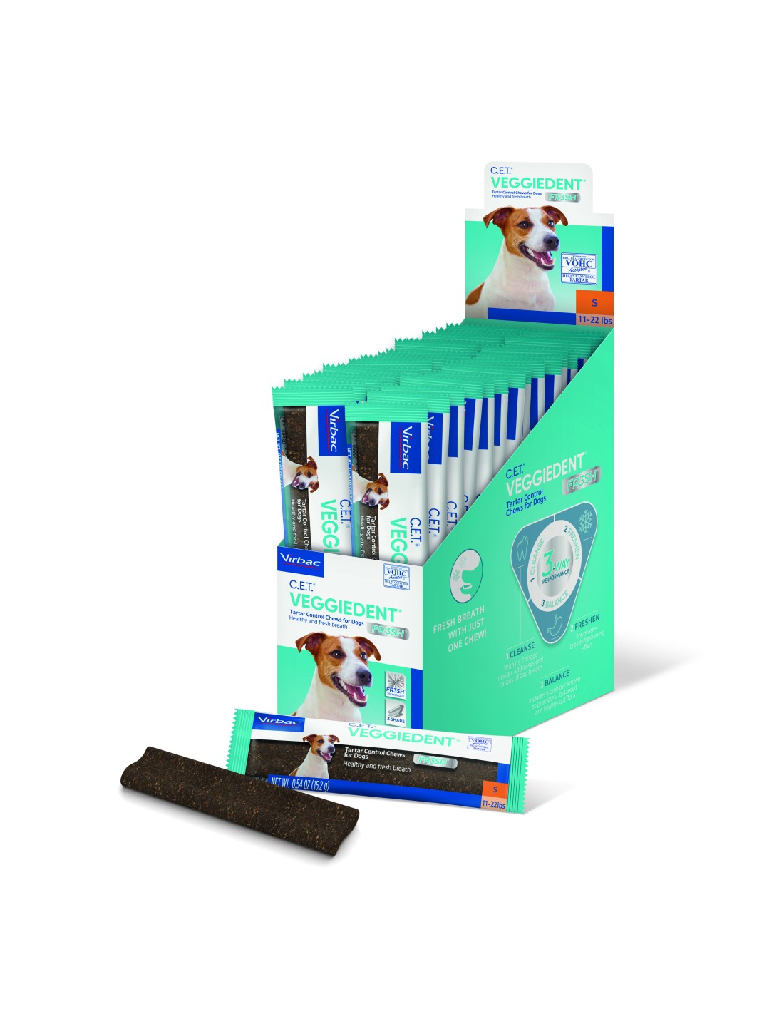Veggiedent Fr3sh S es un snack dental diseñado específicamente para perros de razas pequeñas (1-10 kg), que combate el mal aliento y mantiene la higiene bucodental. Este producto está certificado por la VOHC, garantizando su eficacia en el control de placa y sarro.