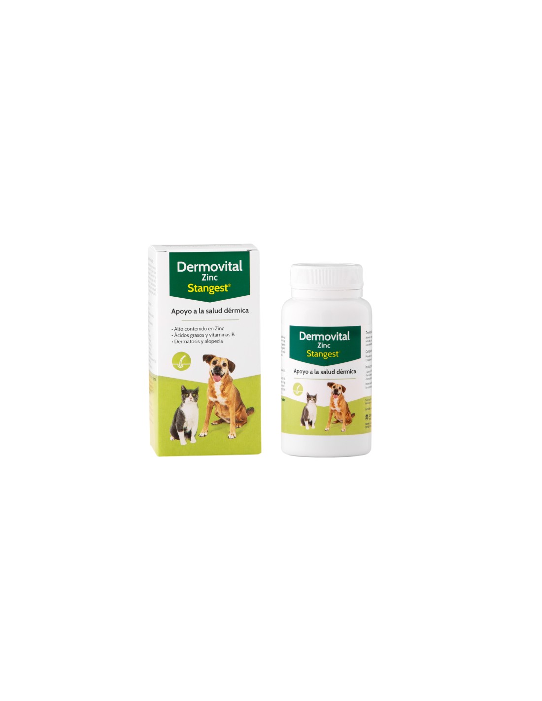 Dermovital Zinc 60 comprimidos es un suplemento dietético formulado para perros y gatos cuya función principal es contribuir al mantenimiento saludable de la piel y el pelaje, especialmente en situaciones de déficit dérmico o problemas dermatológicos.