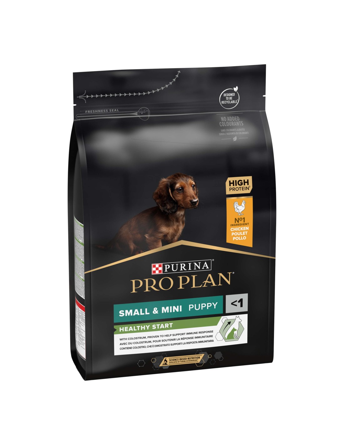 PURINA® PRO PLAN® Puppy Small & Mini Healthy Start es un alimento completo para cachorros de razas pequeñas y miniatura, rico en pollo. También es adecuado para perras gestantes / lactantes. Contiene calostro, que se ha demostrado que apoya a la respuesta inmunitaria. 3kg