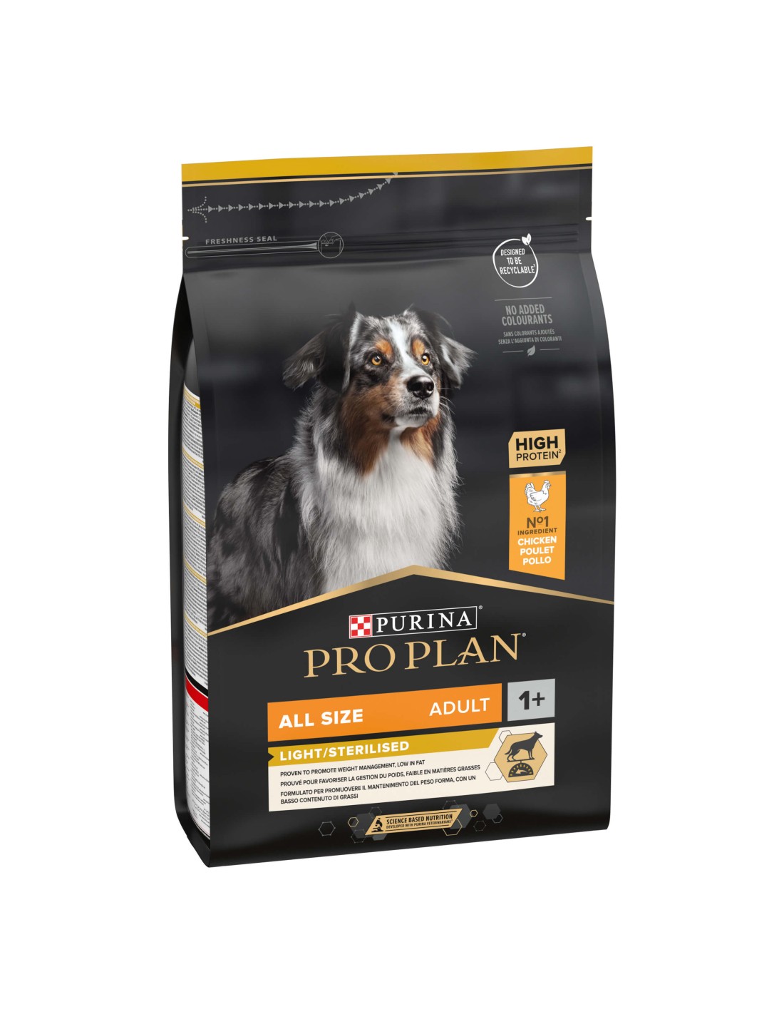 PURINA® PRO PLAN® All Sizes Adult Light / Sterilised rico en Pollo es un alimento completo bajo en grasa para perros adultos de todos los tamaños con sobrepeso o esterilizados. Demostrado que favorece el control del peso. 3kg