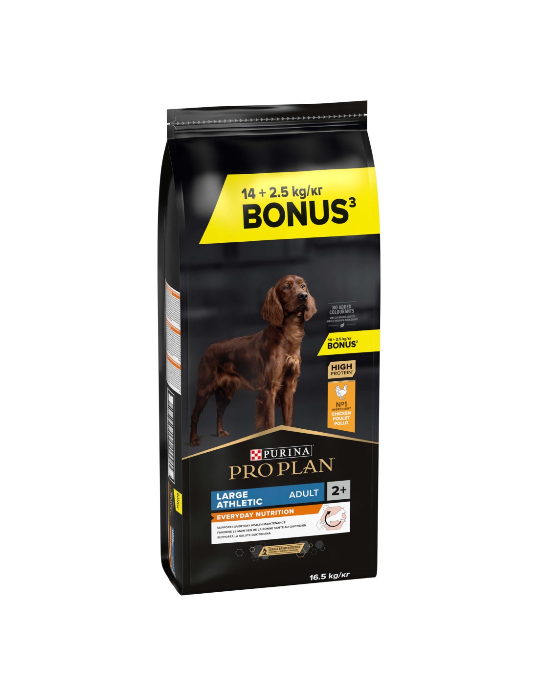PURINA® PRO PLAN® Large Athletic Adult Everyday Nutrition rico en Pollo es un alimento completo para perros adultos de razas grandes de constitución física atlética que apoya el mantenimiento cotidiano de la salud. 14+2,5kg