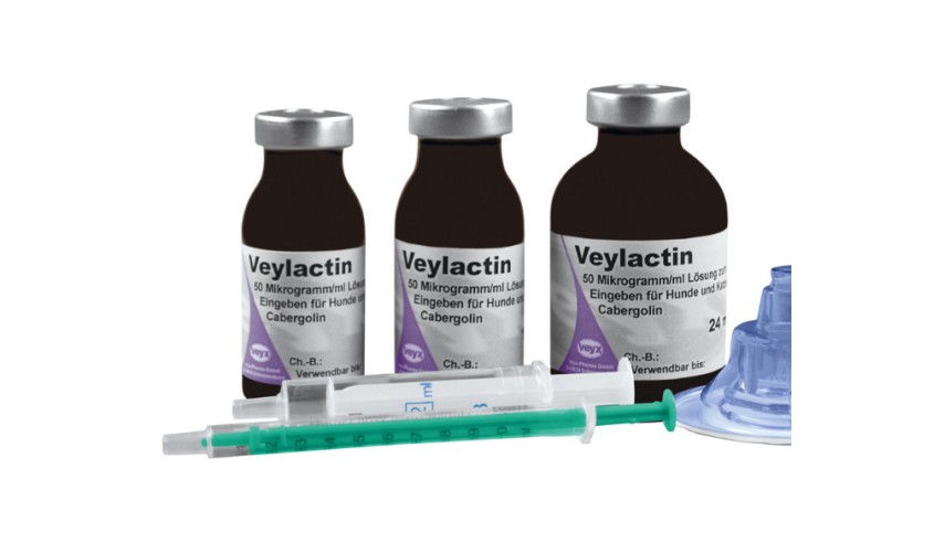 Veylactin 50 µg/ml solución oral es una solución oral de cabergolina indicada para perros y gatos, utilizada en el tratamiento de falsa gestación y supresión de lactancia. Viene en envases de 7 ml, 14 ml o 24 ml. Requiere prescripción veterinaria.