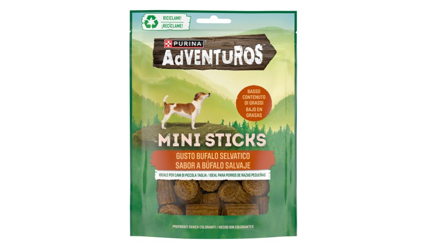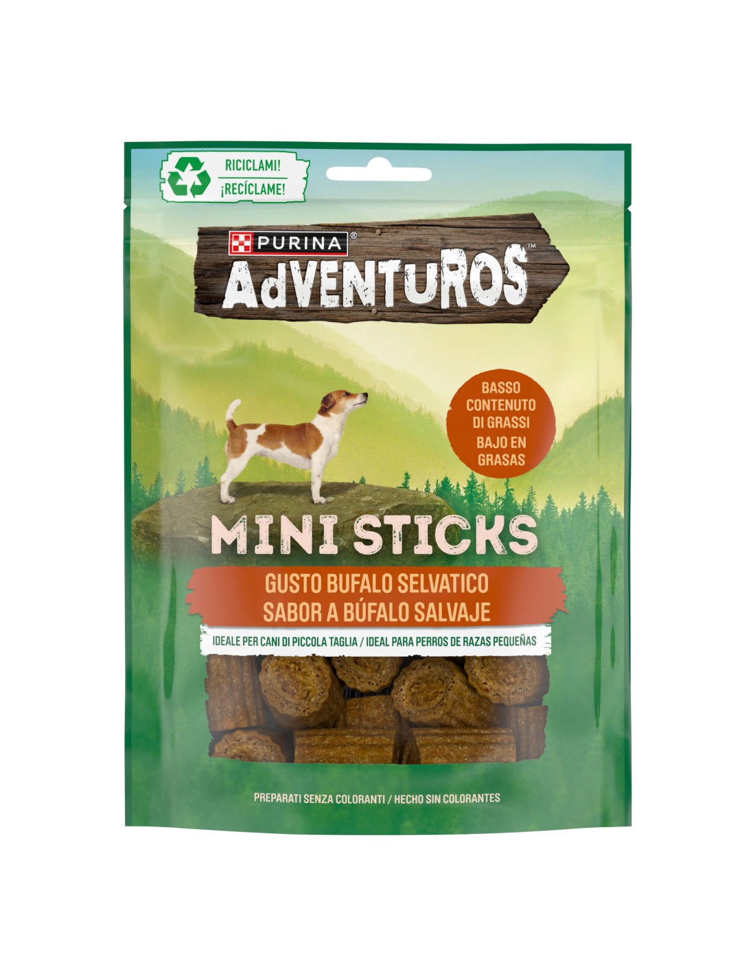 PURINA® ADVENTUROS® Mini Sticks 90g. Snack para perro con búfalo y bajos en grasas. Ideal para razas pequeñas, sin colorantes añadidos. Formato bolsita