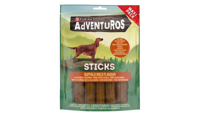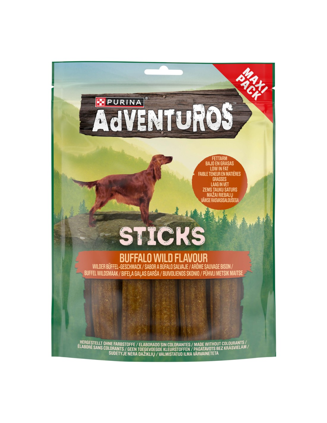 PURINA® ADVENTUROS® Sticks 305g. Snack para perro con sabor a búfalo. Son bajos en grasas y sin colorantes añadidos. Formato bolsita