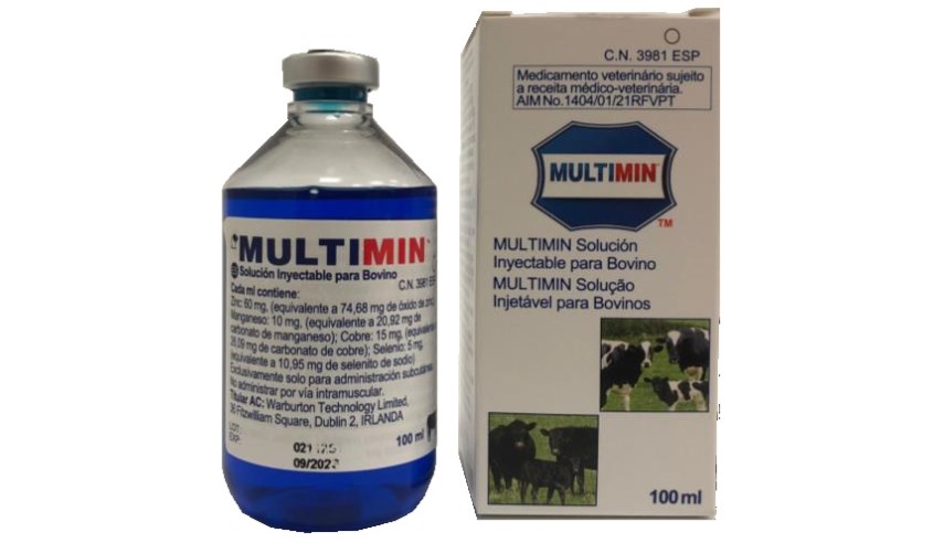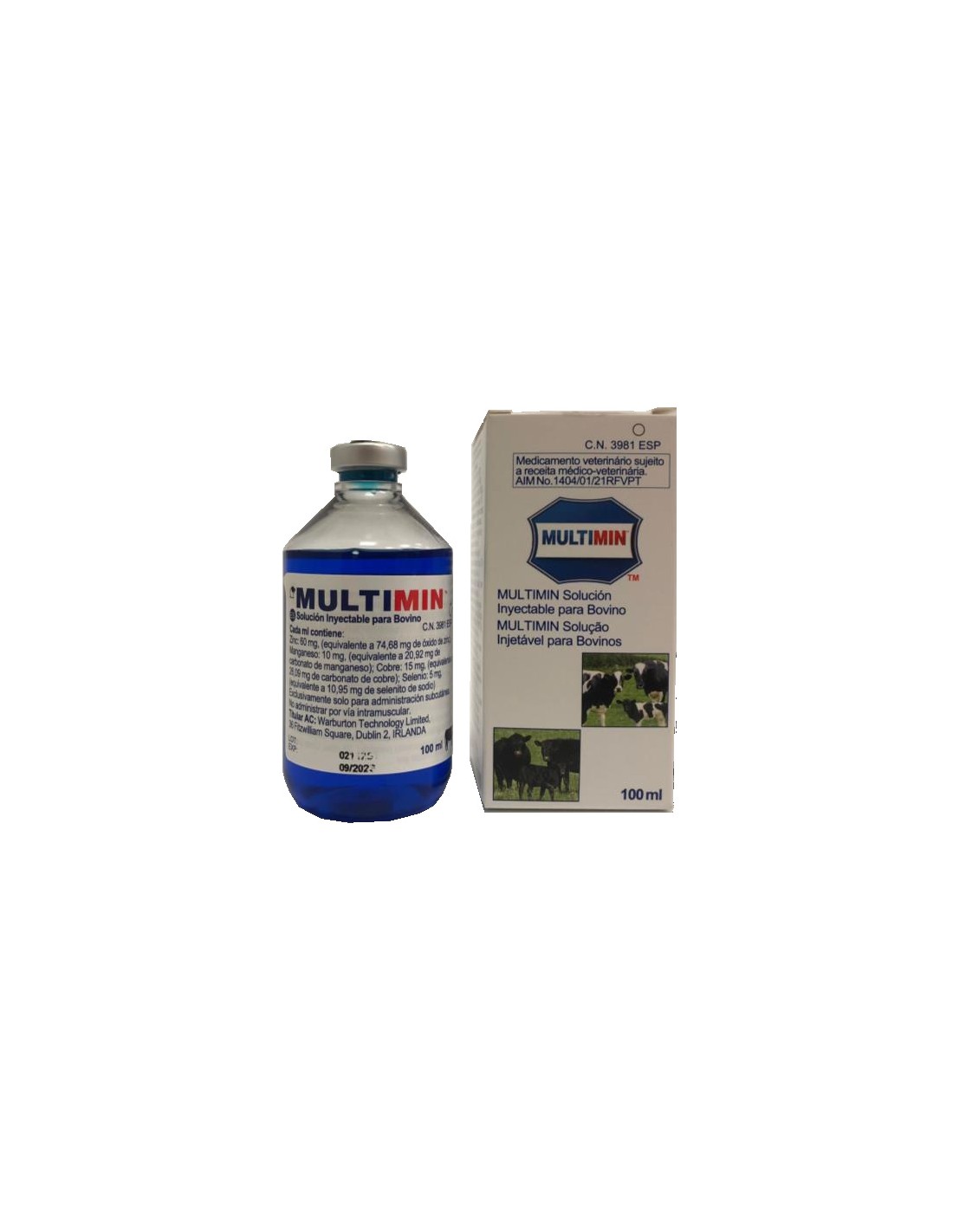 Multimin 100 ML contiene oligoelementos esenciales: Zinc 60 mg/ml, Manganeso 10 mg/ml, Cobre 15 mg/ml y Selenio 5 mg/ml, en una solución acuosa azul transparente.